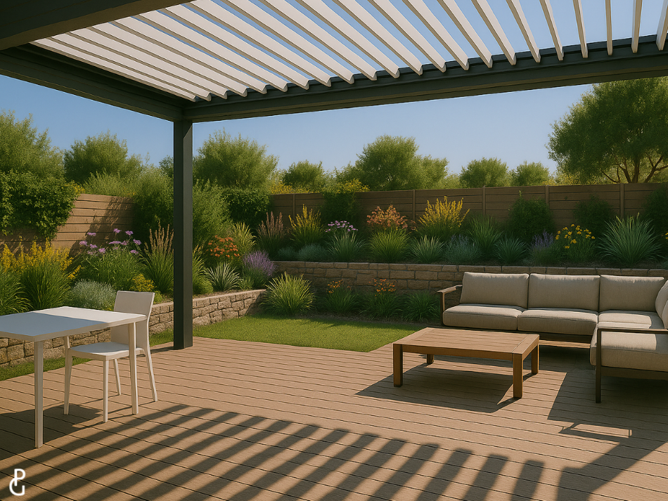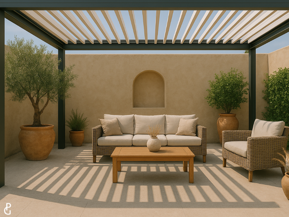 Gracias a sus lamas orientables, puedes controlar fácilmente la entrada de luz, favorecer la ventilación o resguardarte de la lluvia, adaptando el espacio exterior a cada momento del día.